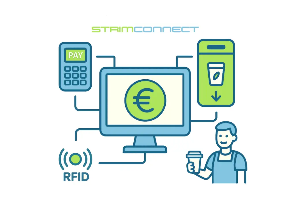 Le client achète des boissons avec sa carte bancaire et paie une caution pour les gobelets. Après le paiement, le lecteur RFID de Point de Vente relie les gobelets servis à la carte bancaire du client.